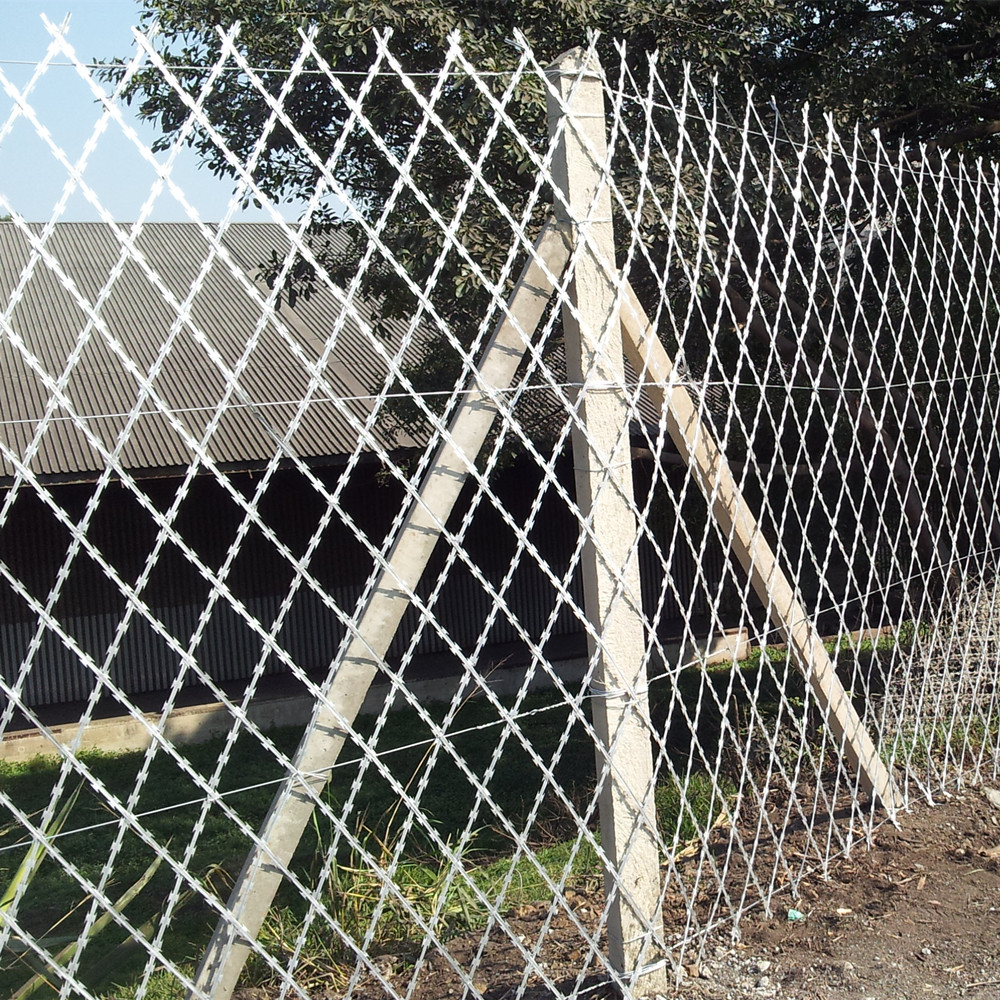 Keevitatud raseerimisvõrk (or Welded razor fence or Diamond razor mesh) is a straight razor barbed wire , welded mesh processed, which can be welded into a diamond, rectangular hole (aperture can be produced according to customers’ requirements), nice, and the card cannot climb down, blocking strong deterrent force strong. It can be integrated with other fence and can also be used alone.